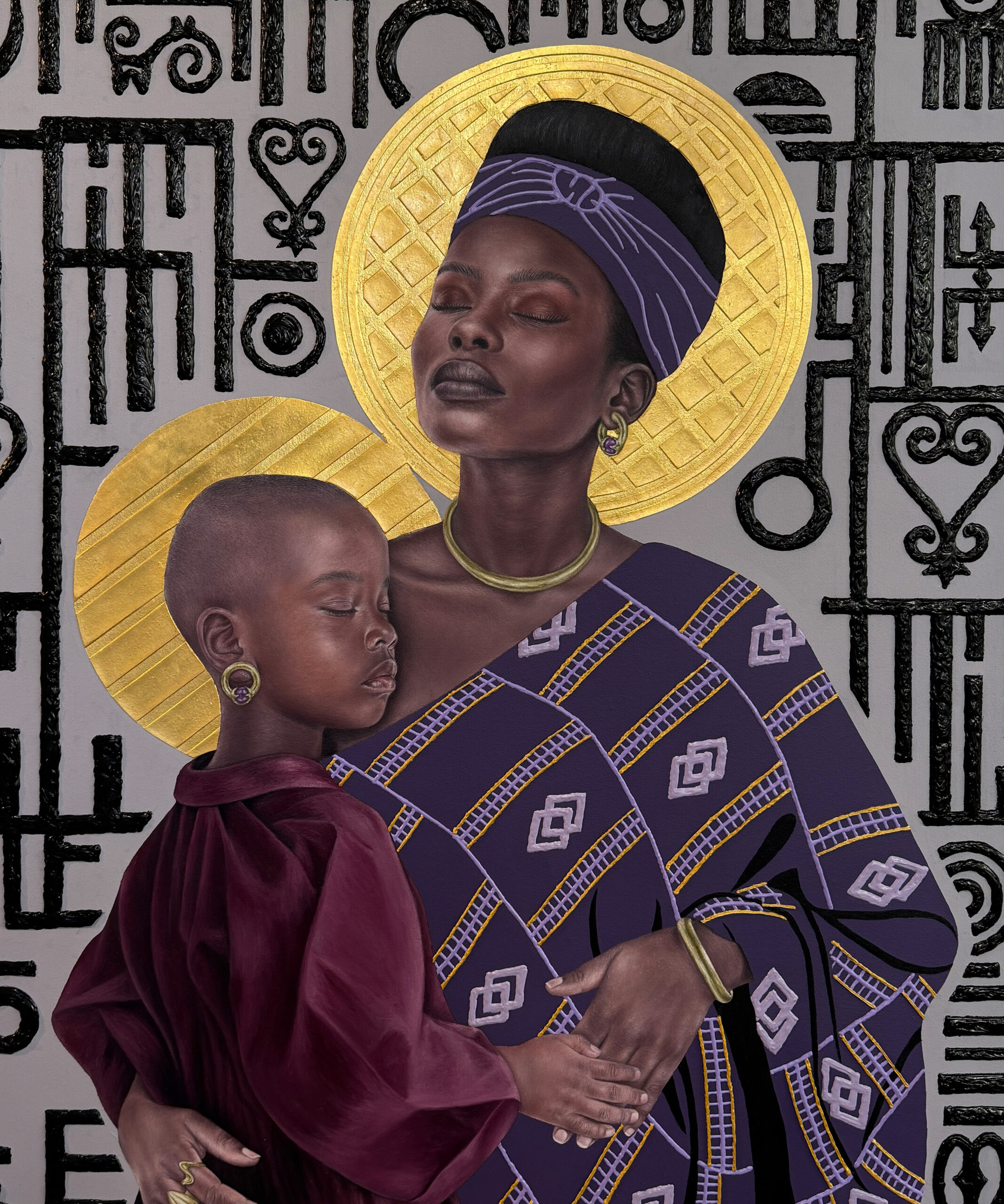 Maame captures a mother holding her child in a protective, spiritual embrace as a tribute to sacred motherhood and ancestral care. Crowned with radiant gold halos, they embody both divinity and dignity. The Adinkra symbols that frame them reflect Ghanaian love, unity, and legacy philosophies. Dressed in traditional fabrics, they symbolise Black maternal power unshaken, timeless, and holy. Maame, meaning “mother” in Twi, honours the first protector and nurturer. The sacred role of mothers in African society inspired Maame. It honours the spiritual bond between mother and child, portraying maternal care as nurturing, divine, and foundational to cultural survival.