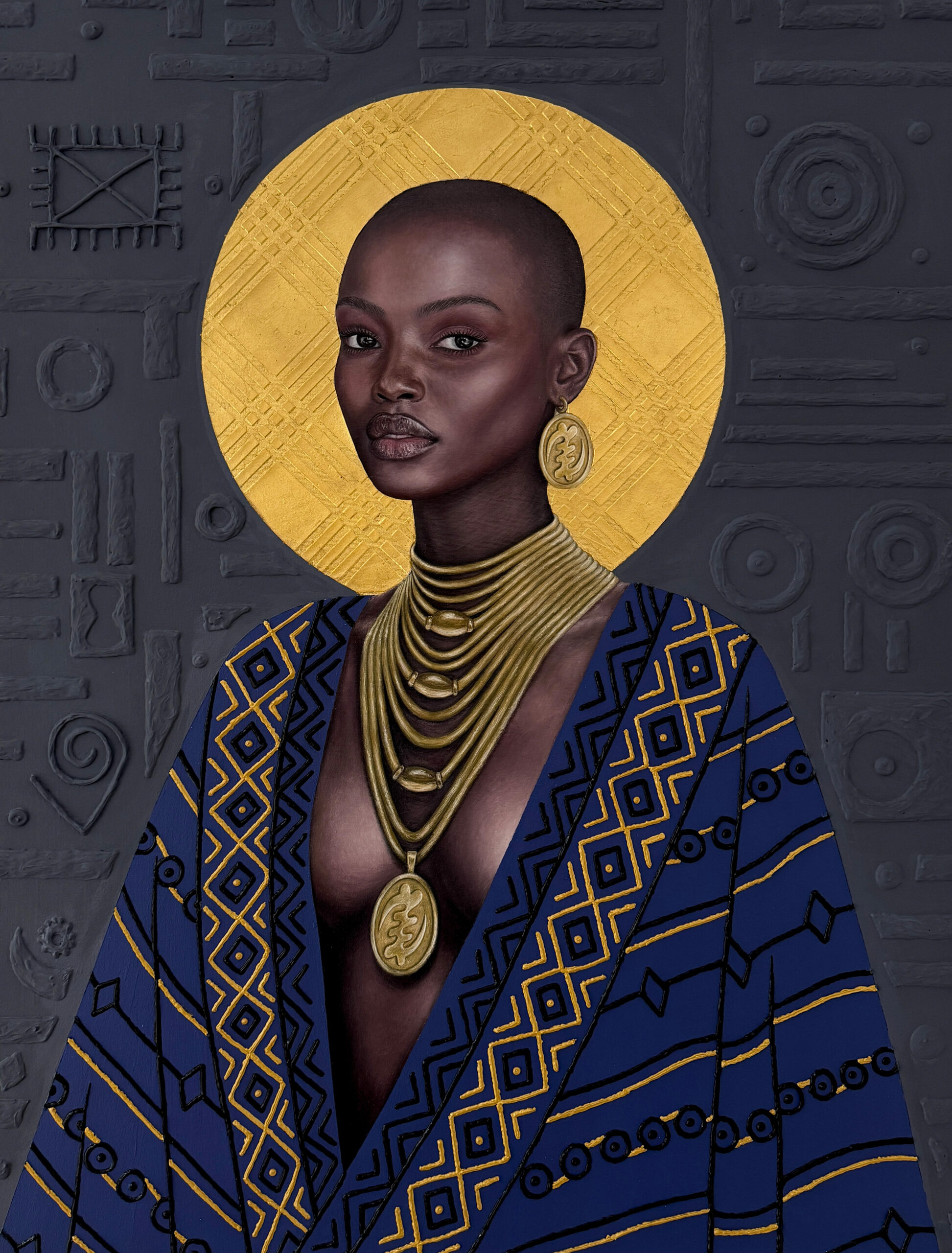 Ohema meaning “queen” in Twi, is a portrait of regal power and divine femininity. Draped in a blue and gold robe with traditional Ghanaian patterns, she stands as both protector and symbol of sacred leadership. Her gold halo radiates spiritual significance, while the textured backdrop of Adinkra and African motifs deepens her connection to legacy and authority. Ohema is not only a queen by title but a vessel of wisdom, history, and strength. Inspired by matriarchal leadership, Ohema is a tribute to the ancestral queens, spiritual guides, and powerful women who shape communities. Her gaze, posture, and garments all speak to wisdom, responsibility, and divine authority.