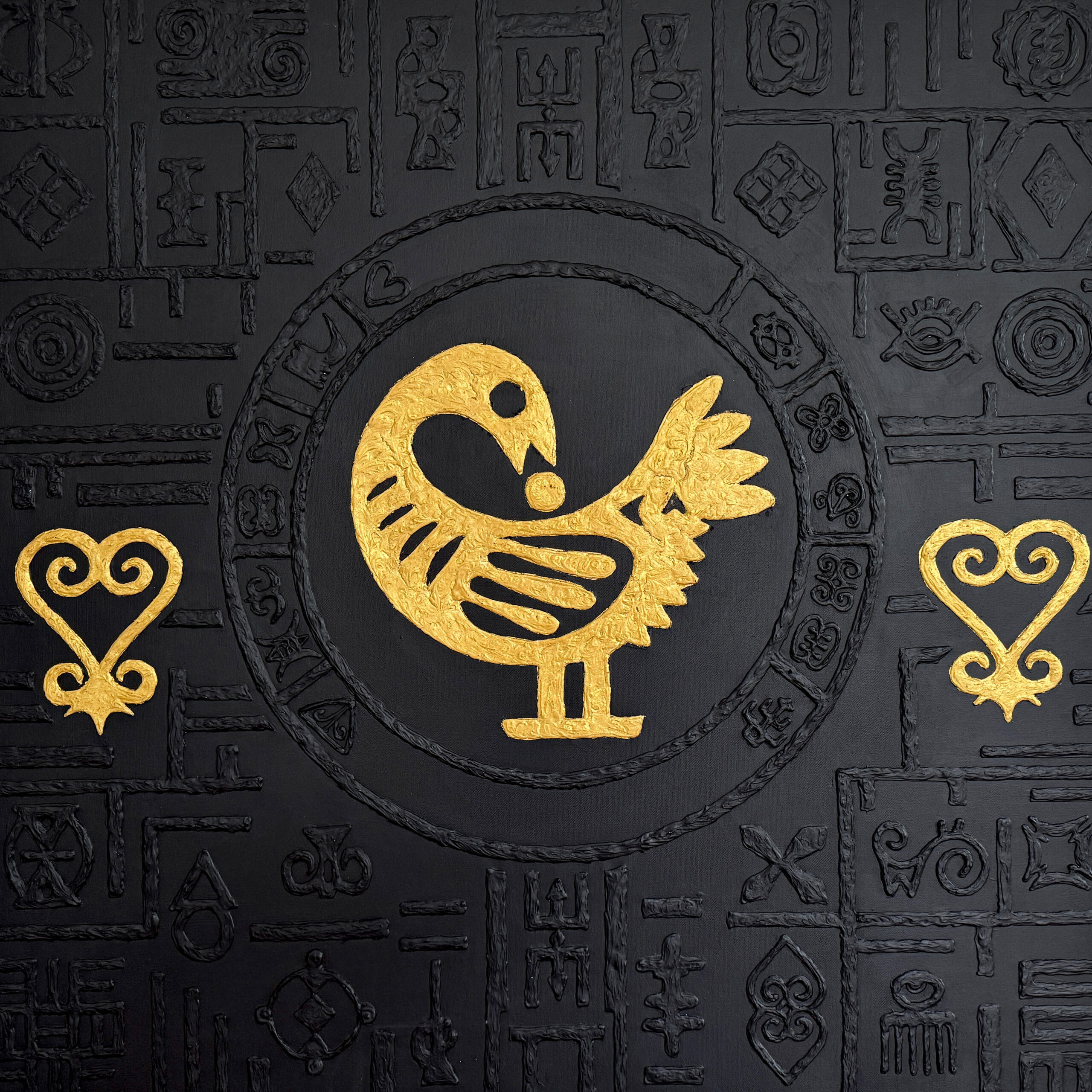 At its core is a golden Sankofa bird, an Akan symbol meaning “go back and get it rendered with elegant simplicity. The dark canvas surrounding it is etched with Adinkra symbols, evoking ancestral wisdom and the idea that understanding our past is essential to shaping our future. Inspired by the Sankofa proverb, this work sets the philosophical tone for the entire collection: a call to retrieve cultural memory and reclaim identity through the power of heritage.
