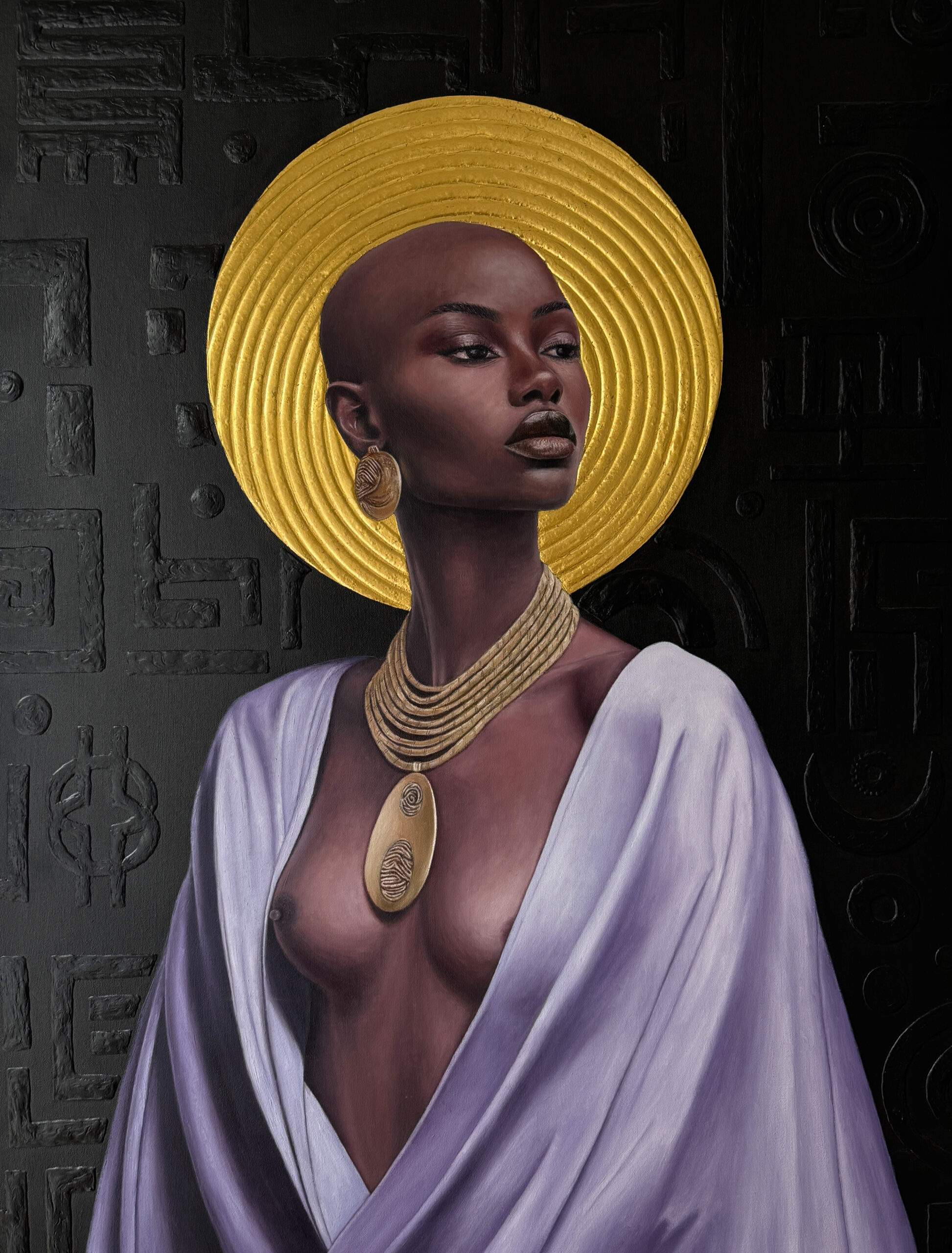 Serwa, a regal, bald woman, stands with unwavering poise. Her exposed chest reflects the authenticity of precolonial Ghanaian dress, free from Western-imposed shame, while gold earrings and a necklace radiate ancestral elegance. Draped in soft lilac fabric, she embodies both grace and strength. A golden halo crowns her as divine, and the backdrop of Adinkra symbols and African motifs grounds her in a lineage of wisdom.